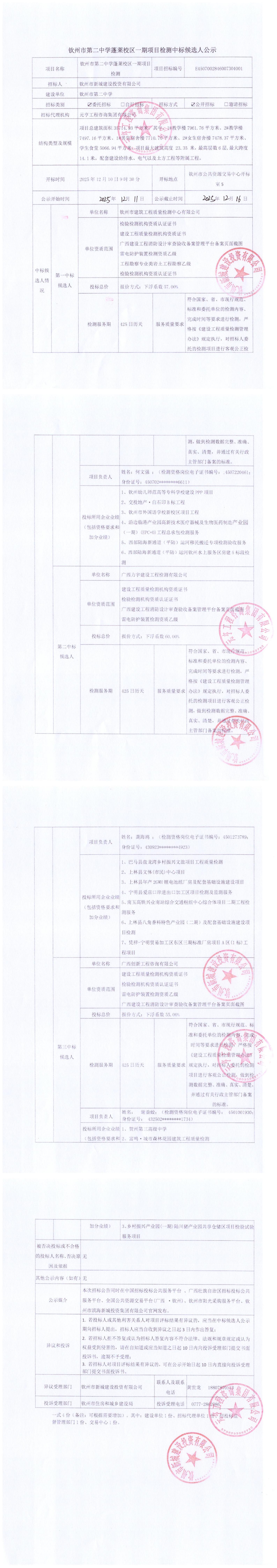 欽州市第二中學(xué)蓬萊校區(qū)一期項(xiàng)目檢測中標(biāo)候選人公示