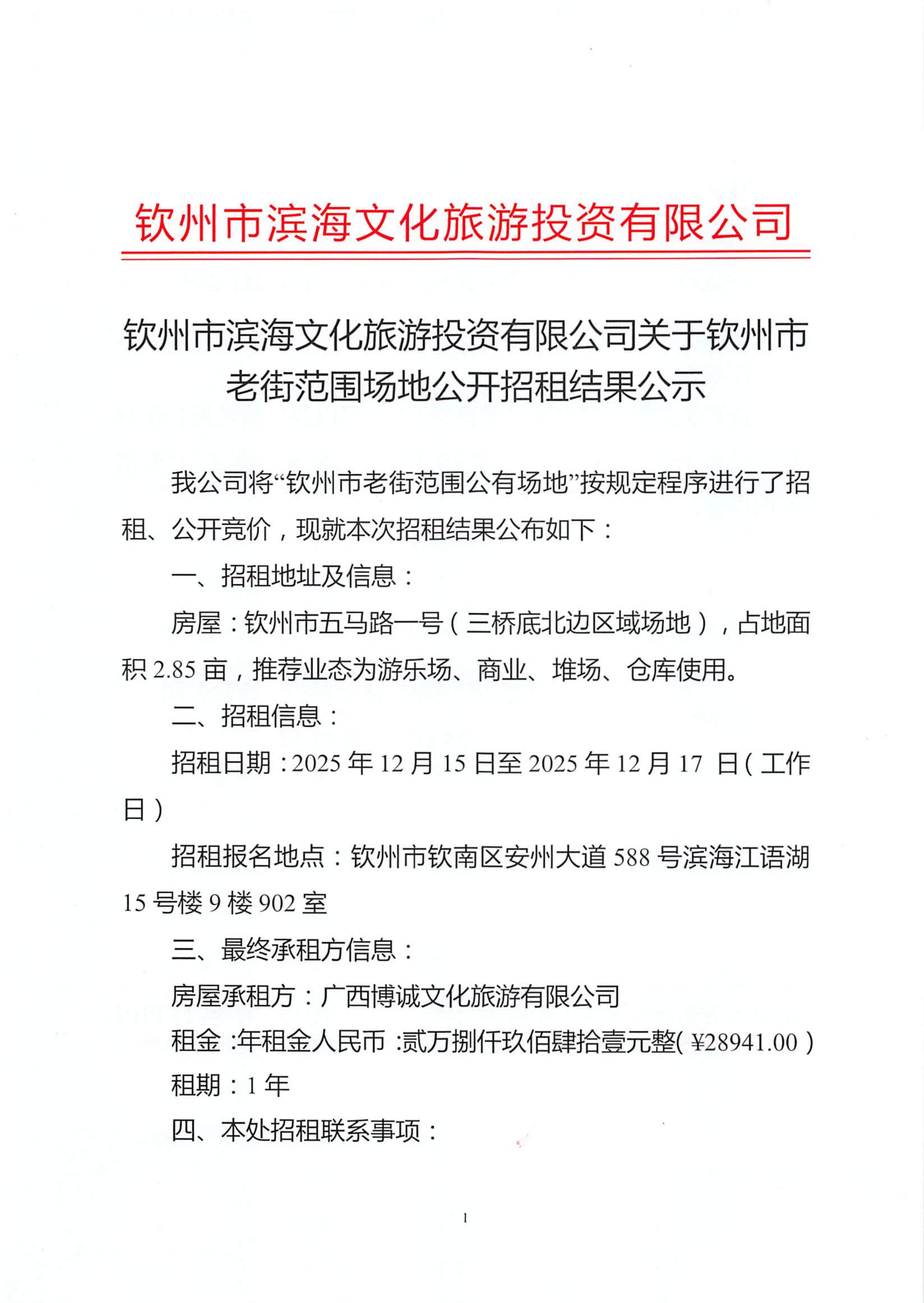 欽州市濱海文化旅游投資有限公司關(guān)于欽州市老街范圍3處房屋(場地)公開招租結(jié)果公示(沙尾街20號、中山路139號、中山路201號)