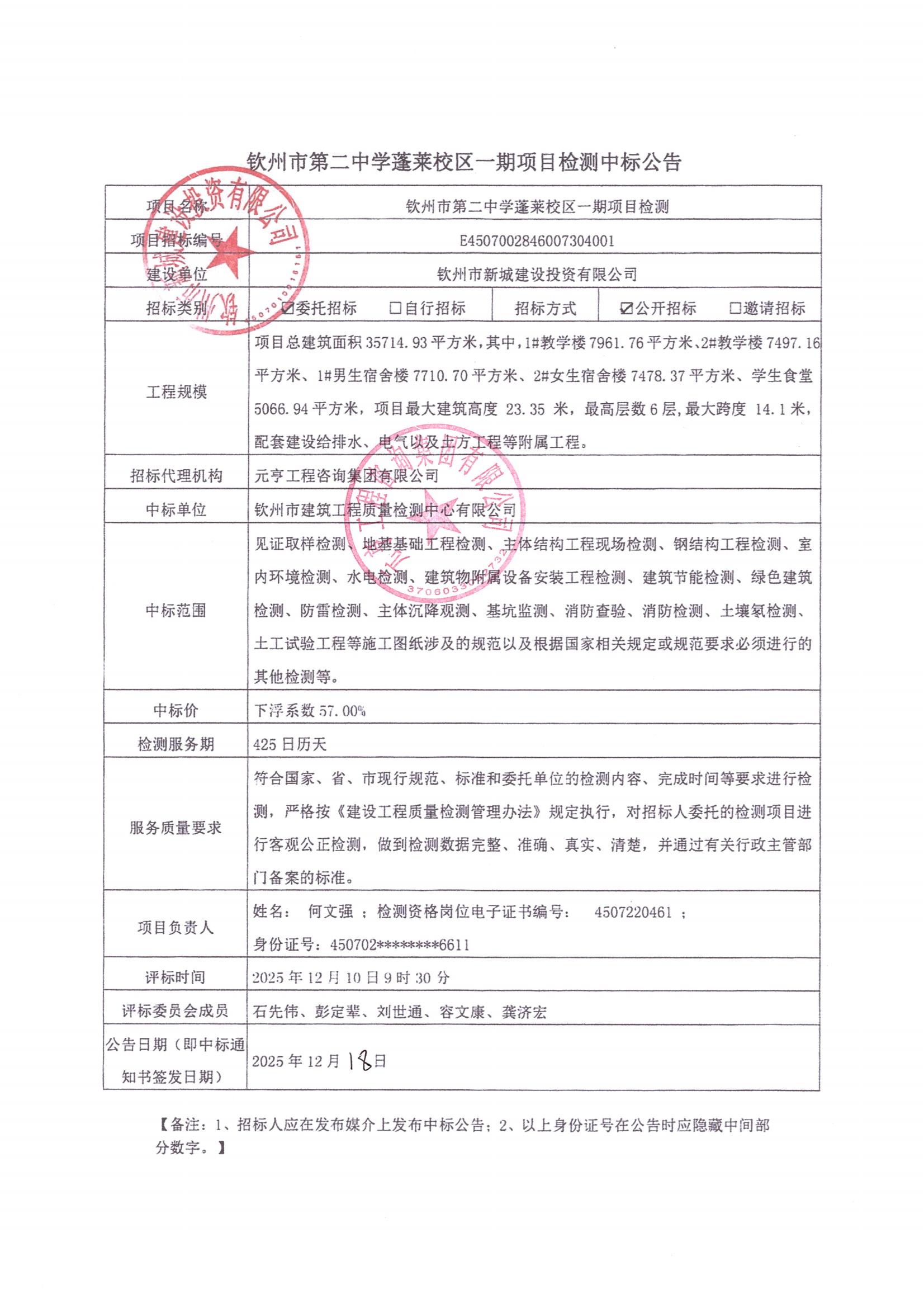 欽州市第二中學(xué)蓬萊校區(qū)一期項(xiàng)目檢測中標(biāo)公告