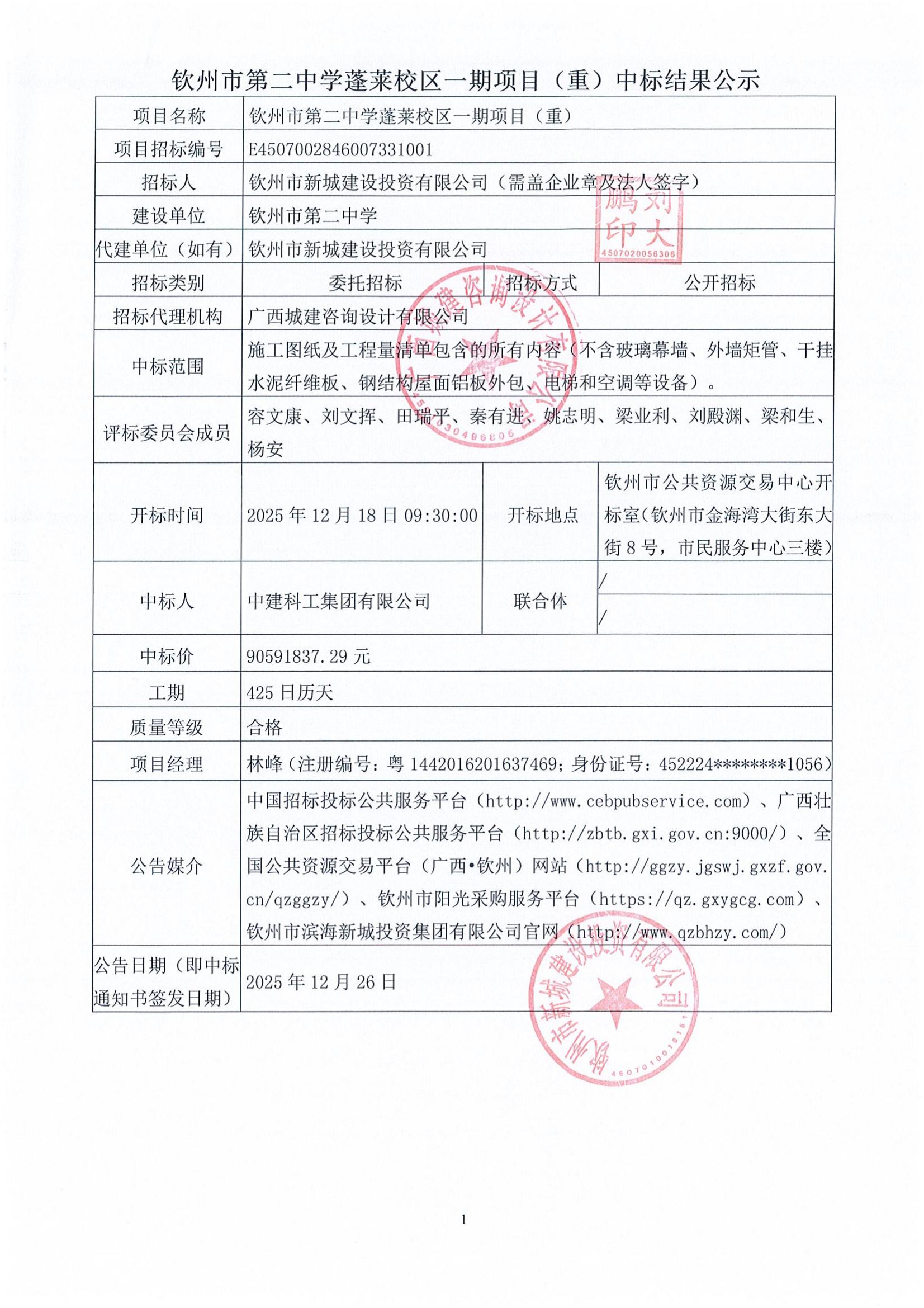 欽州市第二中學(xué)蓬萊校區(qū)一期項(xiàng)目(重)中標(biāo)結(jié)果公示