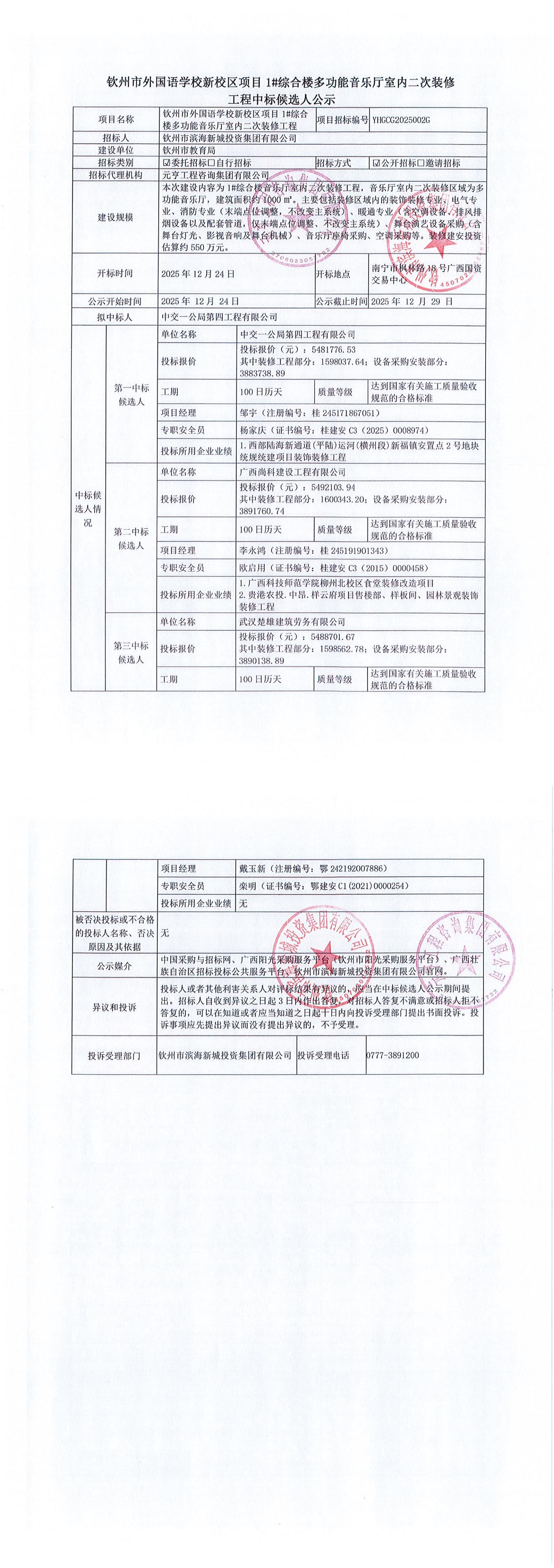 欽州市外國語學(xué)校新校區(qū)項(xiàng)目1#綜合樓多功能音樂廳室內(nèi)二次裝修工程中標(biāo)候選人公示