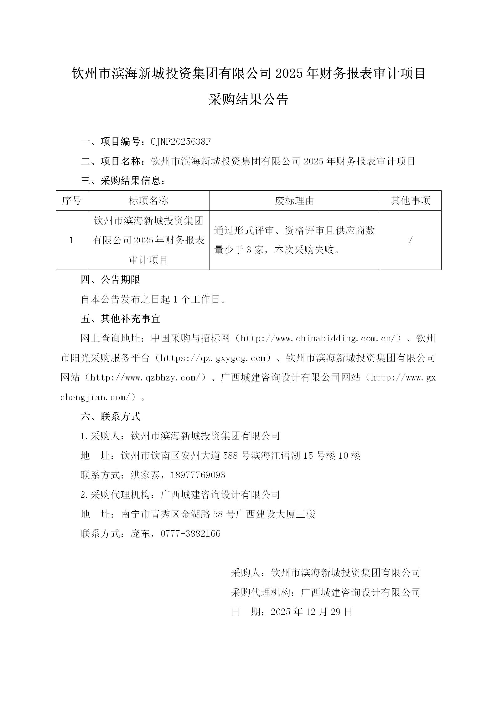 欽州市濱海新城投資集團(tuán)有限公司2025年財(cái)務(wù)報(bào)表審計(jì)項(xiàng)目采購結(jié)果公告