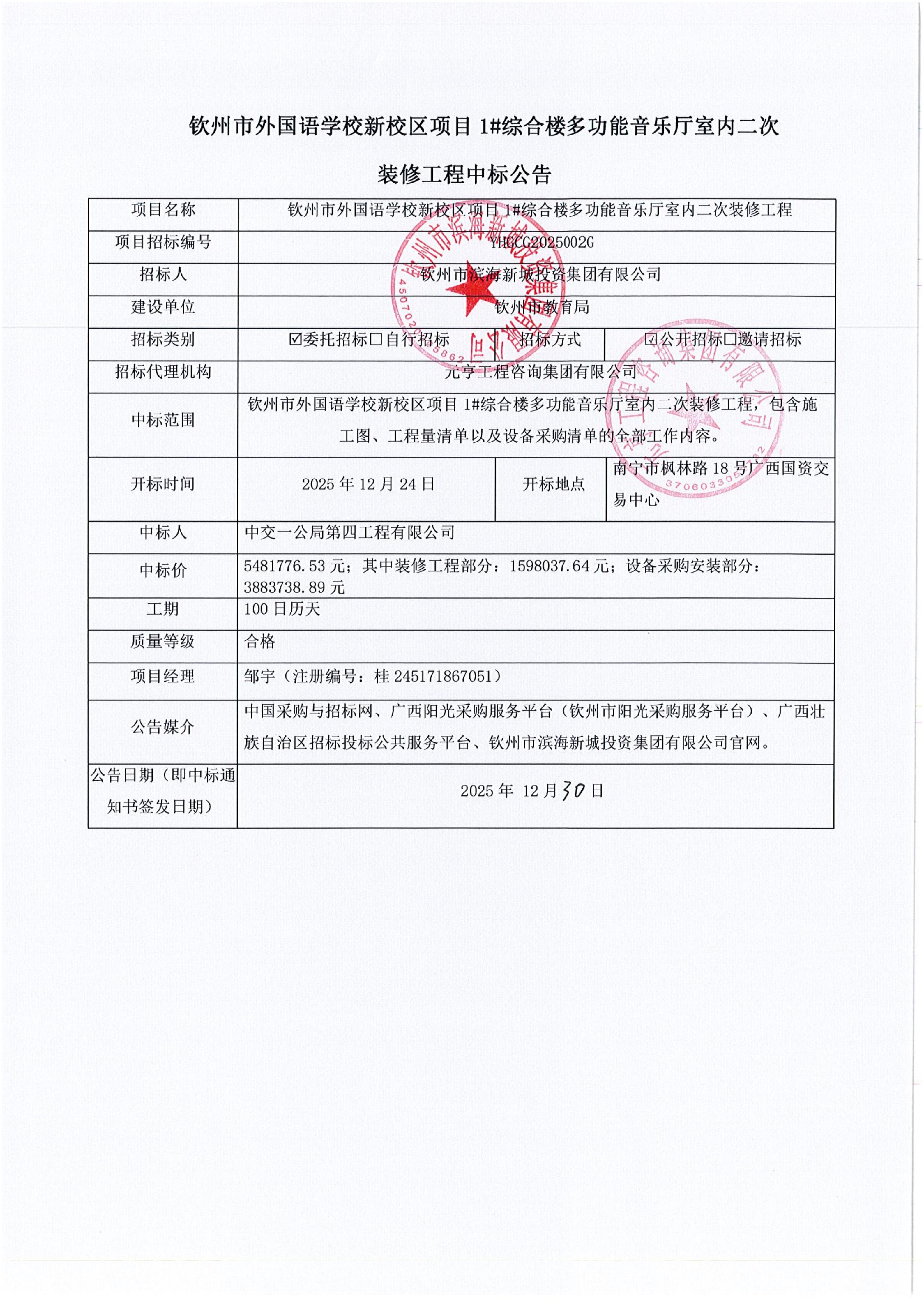 欽州市外國語學(xué)校新校區(qū)項(xiàng)目1#綜合樓多功能音樂廳室內(nèi)二次裝修工程中標(biāo)公告