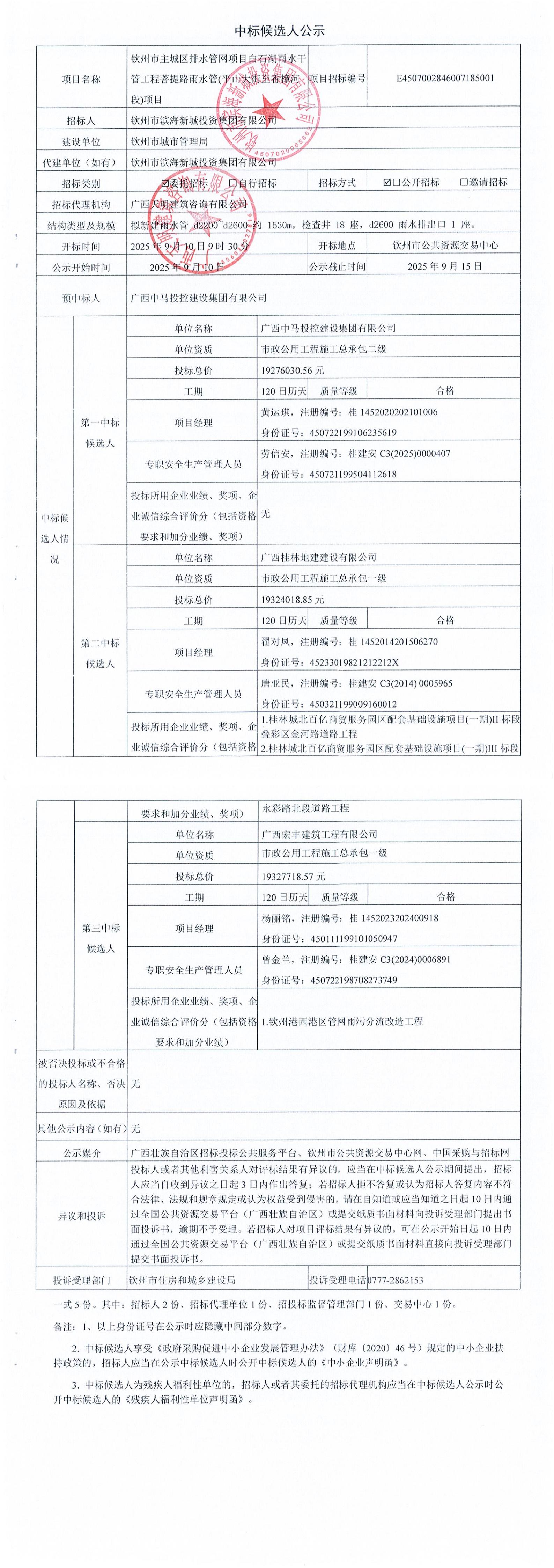 欽州市主城區(qū)排水管網項目白石湖雨水干管工程菩提路雨水管(平山大街至香樟河段)項目中標結果公示