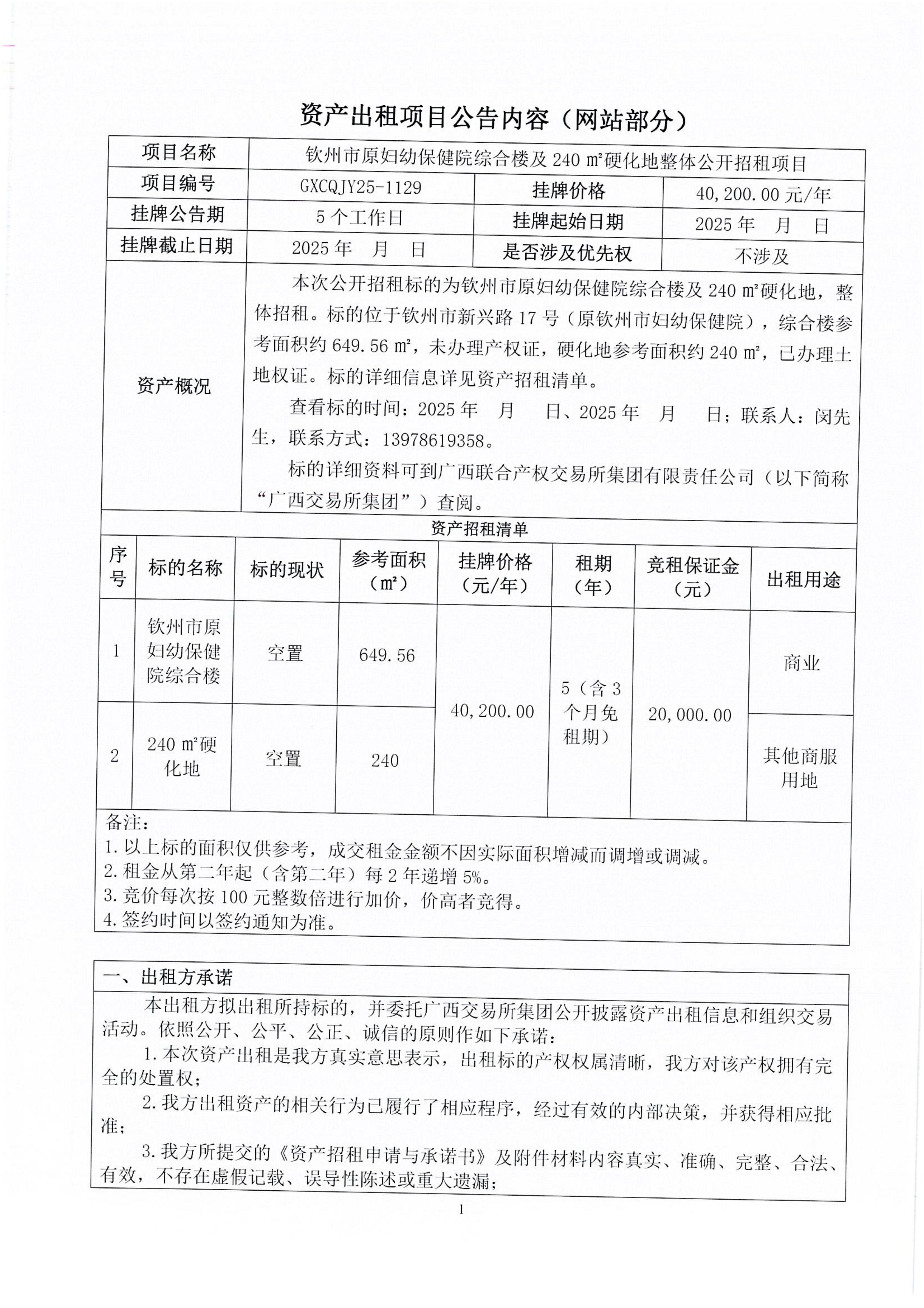 欽州市安惠一園幼兒園資產(chǎn)出租項(xiàng)目公告內(nèi)容(公共資源)