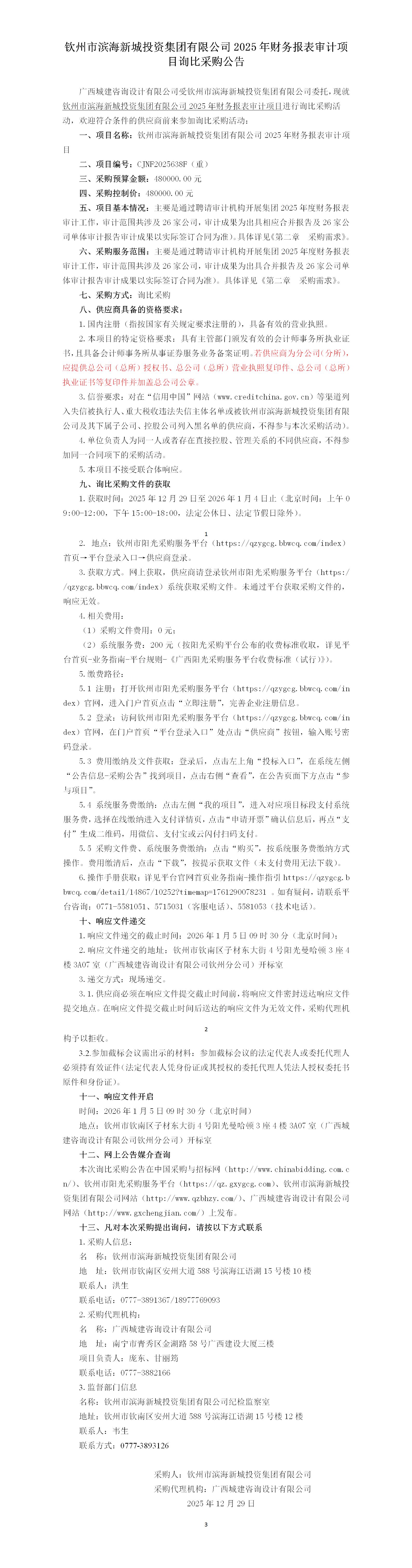 欽州市濱海新城投資集團(tuán)有限公司2025年財(cái)務(wù)報(bào)表審計(jì)項(xiàng)目詢比采購公告