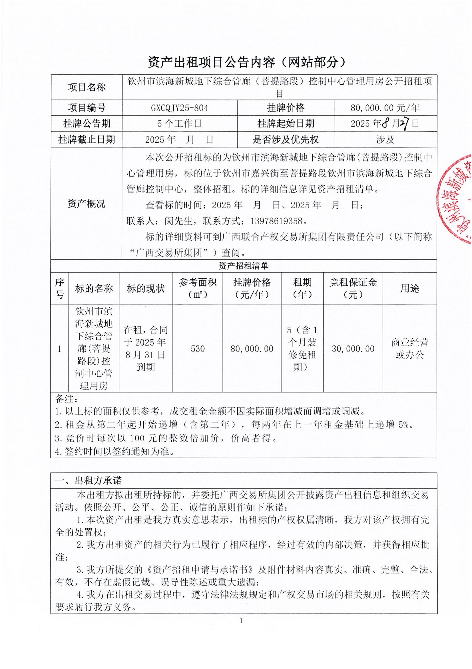 欽州市濱海新城地下綜合管廊(菩提路段)控制中心管理用房公開招租項(xiàng)目